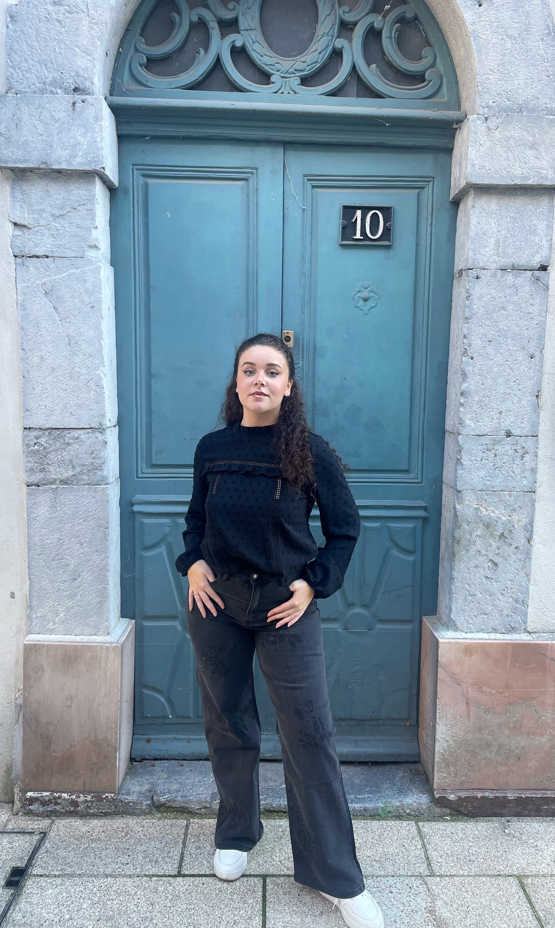 Ce chemisier noir à pois en relief allie élégance et originalité. Sa texture délicate apporte du volume et du caractère, tout en restant légère et fluide. Une pièce chic et moderne, parfaite pour toutes les occasions.