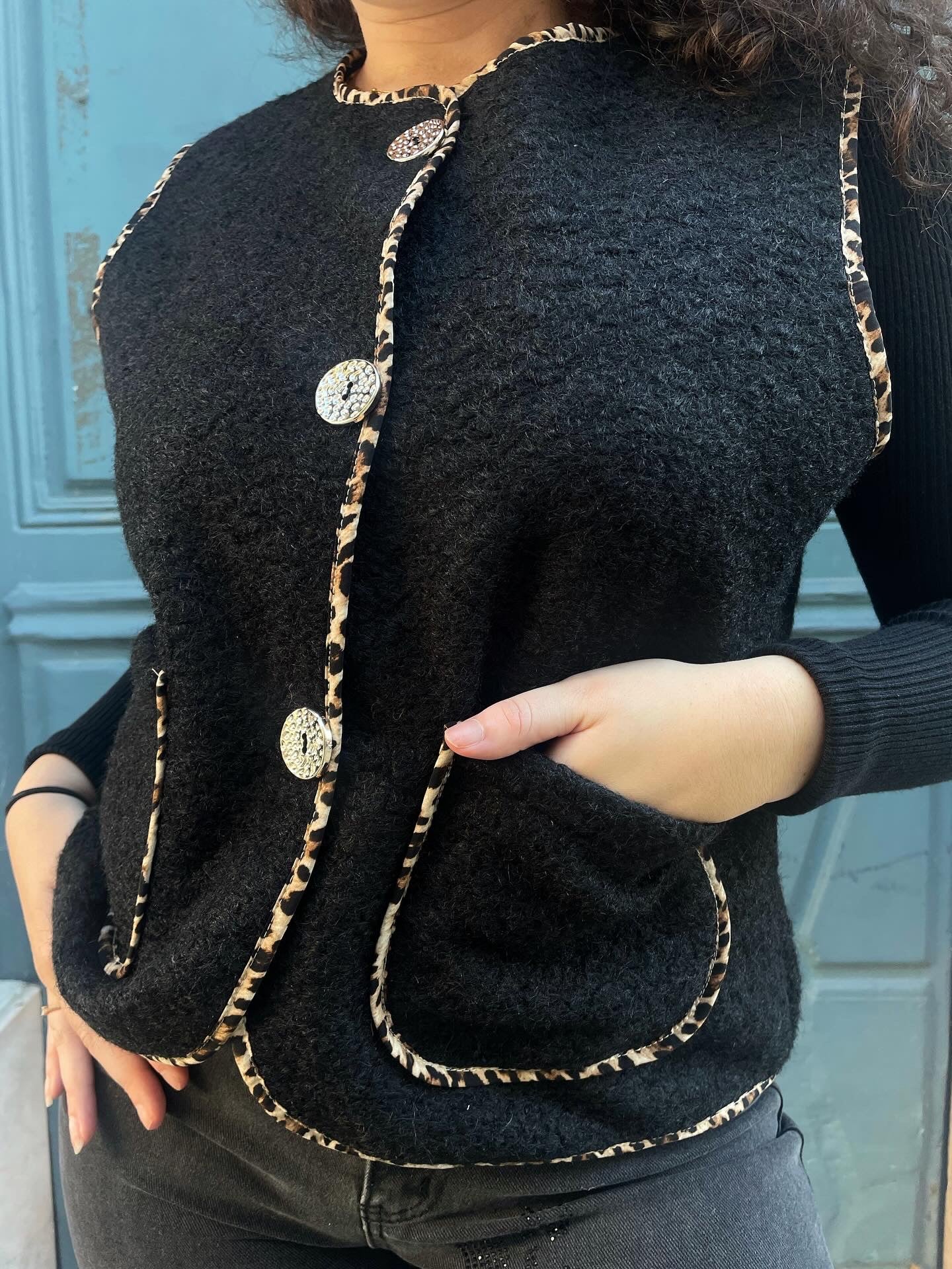 Ajoutez une moderne à vos tenues avec ce gilet au motif léopard, orné de poches pratiques à l’avant et de détails léopard subtils pour un look moderne et tendance. Parfait pour dynamiser vos looks casual ou habillés.