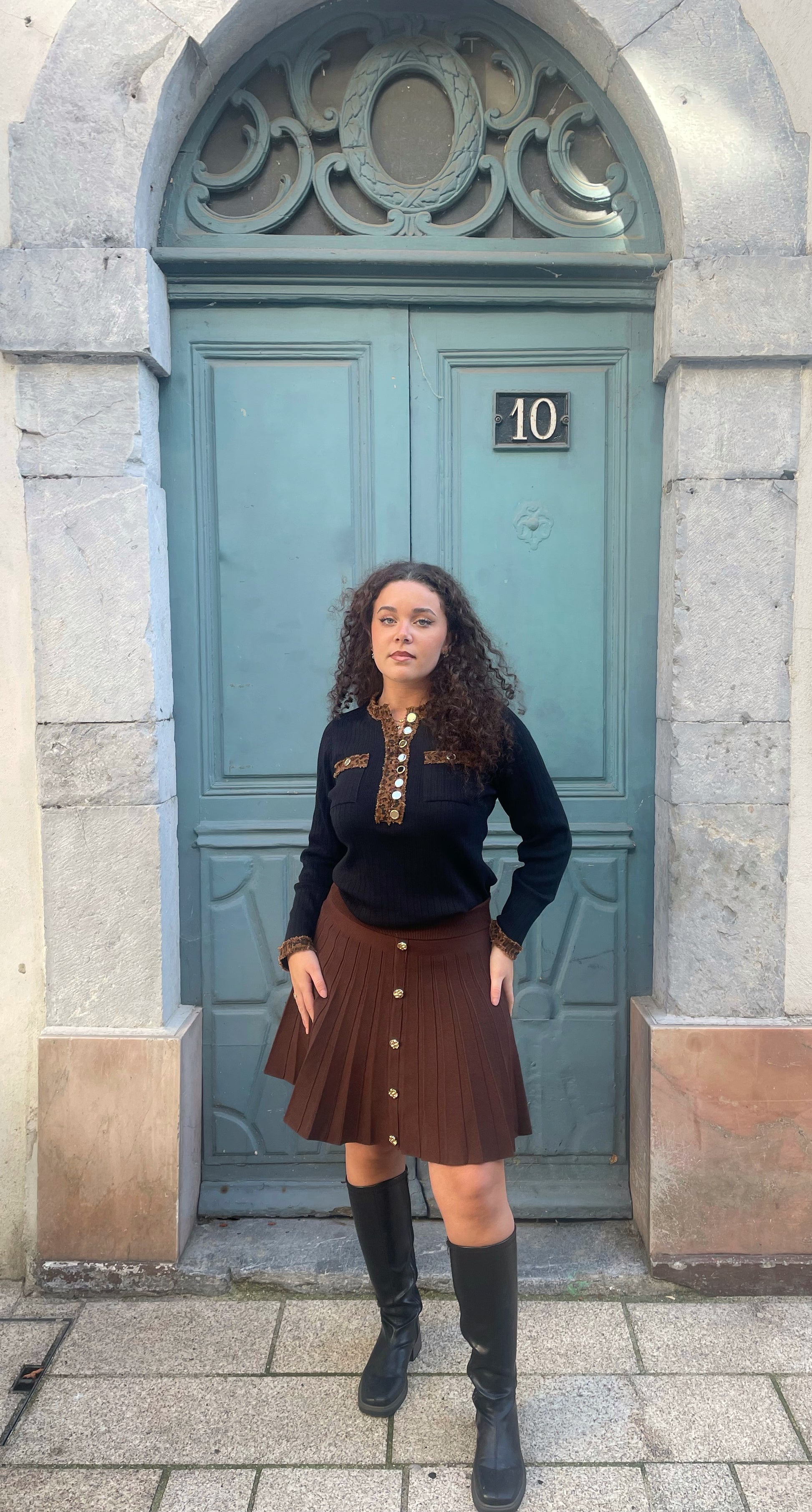 Ce modèle unique se distingue par ses détails léopard raffinés sur le col et les manches, ainsi que ses boutons décoratifs qui ajoutent une touche chic et féminine.